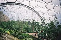 Komplexu budov dominují dva velké uzavřené celky, které se skládají z přiléhajících geodetických kopulí, kde jsou pěstovány tisíce druhů rostlin[3]. Každá z menších částí napodobuje přírodní biom. Kopule se skládají ze stovek šestihranných a pětibokých, nafouknutých, plastových buněk na ocelových rámech. První z menších částí napodobuje tropické prostředí a druhá středomořské prostředí.