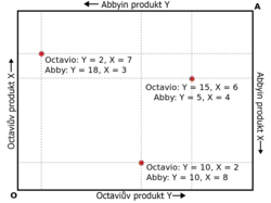 Máme dvě osoby (Octavia a Abby) a dané fixní zdroje pro oba dohromady, řekněme 10 litrů vody a 20 rohlíků. Tj., když Abby bude chtít 4 litry vody a 5 rohlíků, pro Octavia zbude 6 litrů vody a 15 rohlíků.