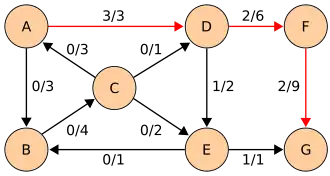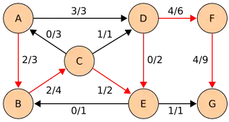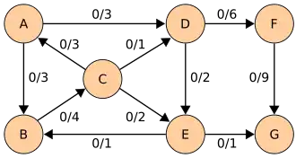 Dvojice na hranách reprezentují současný tok a kapacitu . Dostupná kapacita hrany z vrcholu do vrcholu je , tedy celková kapacita minus použitý tok. Je-li tok hranou z vrcholu do vrcholu záporný, přičítá se ke kapacitě.
