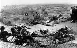 Fotografie mrtvých mužů na poli La Alianza během Tichomořské války v roce 1879. „Fotografie poručíka dělostřelectva Luise Solo de Zaldívara Alemparteho, který spolu se dvěma svými vojáky pohřbívá skupinu tří bolivijských vojáků padlých v bitvě u Tacny. Vyvýšenina za skupinou je tvořena zeminou, která již pokrývá jinou, početnější skupinu mrtvých. Všechny temné hrůzy války lze pochopit jen pohledem na tento ponurý výjev. Nezřetelní, roztrhaní a zohavení mrtví končí pod zemí, promíchaní a často navždy zapomenutí.“ (Převzato z chilského deníku El Nuevo Ferrocarril, 23. září 1880.) -