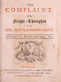 - The Complaint, or Night-Thoughts on Life, Death, and Immortality (Nářek aneb Noční rozjímání o životě, smrti a nesmrtelnosti), rozsáhlá didaktická báseň vznikající postupně v letech 1742–1745. Jde o dramatický monolog, vlastně o emocionální kázání o nevyhnutelné smrti, která se týká každého, skládající se téměř z deseti tisíc veršů v blankversu, rozdělených do devíti nocí, ve kterých se střídá moralizování, meditace, vášeň, melancholie, smutek i povznesenost. Ve skutečnosti je to přísné napomenutí, které by mělo přivést každého k vystřízlivění a k zamyšlení nad svým životem, ale na základě poněkud posunutých výkladů se báseň stala základním dílem tzv. hřbitovní školy, měla veliký ohlas po celé Evropě a významně se podílela na vzniku romantického světobolu.[3] V letech 1795 až 1797 vznikly návrhy ilustrací k básni, jejichž autorem je William Blake.[4]