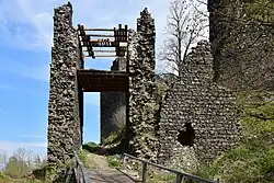 V sedle před hradem se nacházelo předhradí, ze kterého se zachovala ve skále vytesaná nádrž na vodu. Do hradu se vstupovalo malou věží s jednoduchým vějířovitým předbraním. Po průchodu věží příchozí po mostě překonali příkop a vstoupili do brány v další věži. Ta byla na zadní straně otevřená a ze strany k ní přiléhala strážnice. Cesta potom vedla mezi severní hradbou a hradním jádrem na první nádvoří.[2] Obránci mohli cestu kontrolovat z šestiboké věžice přistavěné ke hradbě jádra.