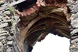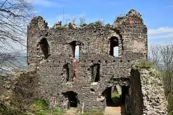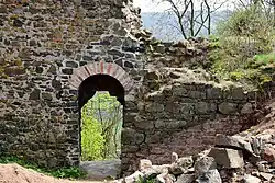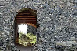 První nádvoří na severovýchodě uzavírala hospodářská budova, ze které se zachoval zejména valeně zaklenutý sklep.[2] Z nádvoří vedla rampa k bráně do hradního jádra vestavěné do přízemí paláce. Brána se uzavírala padacím mostem. Průjezd za bránou se mírně rozšiřuje a vede na druhé nádvoří, které odděluje hlavní palác s lichoběžníkovým půdorysem a menší palác s půlkruhovým půdorysem. Oba paláce spojovala mohutná hradba, která tak vytvořila přibližně obdélníkové nádvoří. V úrovni druhého patra ho obíhala pavlač. Velká část nádvoří je zasypaná destrukcí zdiva nádvorní strany půlkruhového paláce.[3]