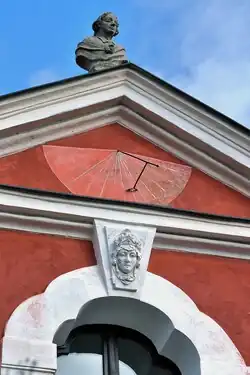 Štít domu je opatřen trojúhelníkovým tympanonem se třemi antikizujícími ženskými bustami, v horní části fasády je pak vyobrazena další ženská hlava. Tyto detaily jsou zřejmě z přelomu 18. a 19. století a představují přechodný sloh mezi rokokem a klasicismem. Ve štítě jsou též vertikální sluneční hodiny.