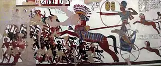 Egyptský faraon Ramesse II. na svém válečném voze poráží Núbijce. Reliéf z chrámu v Beit El Wali.