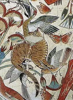 Nástěnná malba z hrobky egyptského písaře Menny – kočka a promyka