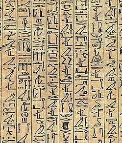 Hieroglyfické písmo bylo velice náročné na zápis, každý znak musel být velice precizně vykreslen, proto se postupem času objevila jeho zjednodušená podoba, která umožňovala rychlejší zápis na papyrové svitky či na střepy (ostraka). Tato podoba bývá označována jako písmo hieratické („kněžské“).