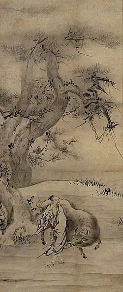 Čao Fu a jeho vůl, kresba tuší na svitku v čínském stylu, Eitoku Kanó, konec 16. století; chrám Daitoku-dži, Kjótó