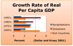 Akceleraci globalizace následoval zrychlený ekonomický růst a snížení globální chudoby. Růst HDP na osobu v 80. letech se zvýšil na 3,5 procenta z hodnoty z 1,4 procenta v 60. letech a 2,9 v 70. letech a na 5 procent v 90. letech. Akcelerace růstu je víc zřetelná s ohledem na pokles růstu v bohatých zemích z hodnoty 4,7 procenta v 60. letech na 2,2 procenta v 90. letech. Neglobalizující rozvojové země měly mnohem horší výsledky, než ty zapojené do globalizace. Tento rychlý růst mezi globalizátory není jen kvůli velkému výkonu Číny a Indie, ale 18 ze 24 globalizátorů zaznamenalo zvýšení růstu, z toho mnozí dost podstatný.