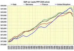 I přes to ale italská ekonomika zaznamenala v 80. letech zásadní problém. V 90. letech se snažila Maastrichtská kritéria omezit velikost státního dluhu, který měla Itálie už ve velikosti 104% jejího HDP.[32] Následné ekonomické restrikce ještě zhoršily globální ekonomickou recesi. V letech 2000–2008 italská ekonomika už spíše stagnovala.[33][34]