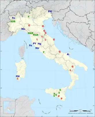 Na začátku 70. let byla Itálie hlavním producentem pyritů (z toskánské maremmy), azbestu (z dolů Balangero), fluoritu (nachází se na Sicílii) a soli. Současně byla soběstačná s hliníkem (Gargana), sírou (Sicílie), olovem a zinkem (Sardinie). Na začátku 90. let však ztratila všechny své světové pozice a v těchto zdrojích již nebyla soběstačná. Neexistují žádné podstatné zásoby železa, uhlí nebo ropy. V posledních letech byly objeveny mírné zásoby zemního plynu, zejména v údolí Pádu a na pobřeží Jaderského moře, které představují nejdůležitější nerostný zdroj v zemi. Itálie je jedním z předních světových producentů pemzy, pucolánu a živce.[50] Dalším nerostným zdrojem, pro který je Itálie známá, je mramor, zejména světově proslulý bílý mramor Carrara z lomů Massa a Carrara v Toskánsku. Většina surovin potřebných pro výrobu a více než 80 % zdrojů energie v zemi se dováží (99,7 % poptávky po pevných palivech, 92,5 % ropy, 91,2 % zemního plynu a 13 % elektřiny).[60][61] Vzhledem k tomu, že se Italové spoléhají na dovoz, platí za elektřinu přibližně o 45 % více, než je průměr v EU.