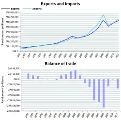 Na úvod je důležité zmínit, že největším obchodním a investičním partnerem je Evropská unie. Byly uzavřeny smlouvy, které zrušili úplně nebo částečně cla na 98,7 % zboží z JAR. Proto ze země odchází nejvíce zboží právě do EU (19,3 %),[21] druhá je Čína (10,7 %),[21] třetí USA (7%)[21]. Struktura dováženého zboží je velmi pestrá od osobních automobilů po nerostné suroviny.[22]