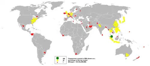 Vláda rovněž vyzvala firmy, aby investovaly mimo Singapur, přičemž celkové přímé investice země do zahraničí dosáhly do konce roku 1998 39 miliard USD. Největším cílem byla Čínská lidová republika, která představovala 14 % celkových zahraničních investic, následovaná Malajsií (10 %), Hongkongem (9 %), Indonésií (8 %) a USA (4 %). Rychle rostoucí ekonomika Indie, zejména odvětví špičkových technologií, se pro Singapur pomalu stává rostoucím zdrojem zahraničních investic. USA neposkytují Singapuru žádnou dvoustrannou pomoc. V posledních letech se to Spojené státy snaží napravit podepsáním dohody o volném obchodě mezi USA a Singapurem. Singapurská daň z příjmu právnických osob je 17 %.[48]