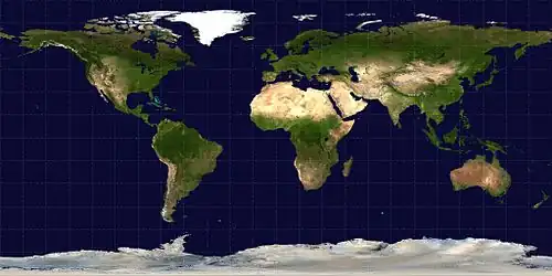 Obrázky, zvuky či videa k tématu Ekvidistantní válcová projekce na Wikimedia Commons - (anglicky) Global MODIS based satellite map