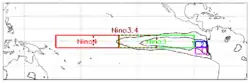 - ↑ LARKIN, Narasimhan K. On the definition of El Niño and associated seasonal average U.S. weather anomalies. Geophysical Research Letters. 2005, roč. 32, čís. 13. Dostupné online [cit. 2023-10-12]. ISSN 0094-8276. doi:10.1029/2005GL022738. (anglicky)
