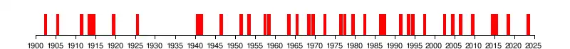 Předpokládá se, že od roku 1900 došlo k nejméně 30 událostem El Niño, přičemž události z let 1982–83, 1997–98 a 2014–16 patří k nejsilnějším v historii[21][16]. Od roku 2000 byly události El Niño pozorovány v letech 2002–03, 2004–05, 2006–07, 2009–10, 2014–16,[21] 2018–19,[28][29][30] a počínaje rokem 2023.[31][32]