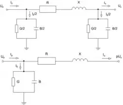 Náhradní jednopólové schéma vedení (výše) a transformátoru (níže)