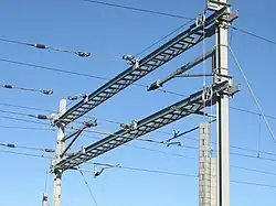 Nejdůležitější jsou proto systémy s vrchním vedením, jednou nebo dvěma trolejemi v bezpečné výšce kolem 4 m nad zemí. Trolej je tvořena silným měděným drátem zvláštního "osmičkového" průřezu, zavěšeným na sloupech. Úseky troleje v max. délce asi 500-800 m se musí napínat závažím a kladkami. U tramvajových vedení jsou závěsy troleje častější, kdežto u železničních vedení je trolej zavěšena na podélném nosném lanu a sloupy jsou ve vzdálenosti 30-50 m.