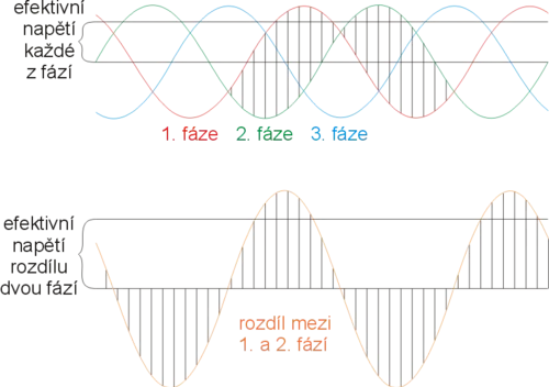 Vztah mezi hodnotou sdruženého napětí (napětí mezi fázemi) a fázového napětí (napětí mezi fází a nulou) se určí následovně: