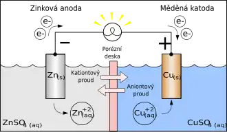Schematické zobrazení galvanického článku CuSO4/Zn (v tomto případě se jedná o Daniellův článek)