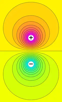 Elektrický dipól, intenzita barvy označuje nejvyšší a nejnižší elektrický potenciál.