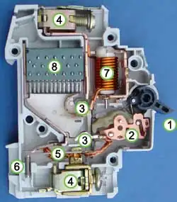 Na obrázku je termomagnetický typ jističe, který ve vybavovacím mechanismu (sloužícím k odpojení obvodu) kombinuje elektromagnetickou a tepelnou spoušť. Ovládací páčka (1) umožňuje jistič vypnout nebo zapnout a zároveň signalizuje stav jističe (vypnuto/zapnuto). Páčka pomocí aretačního mechanismu vypínače (2) ovládá rozpojovací kontakty (3), které přeruší obvod mezi přívodními a odchozími kontakty (4). Bimetalový pásek (5) aktivuje vypínací mechanismus jističe při přetížení (dlouhodobý větší odběr proudu), výrobce ho nastavuje kalibračním šroubem (6). Při zkratu je v cívce (7) vytvořeno magnetické pole, která má ve svém jádře úderník, jež aktivuje vypínací mechanismus. Zhášecí komůrka (8) slouží k zhasnutí elektrického oblouku vzniklého při rozpojení kontaktů jističe.[1]