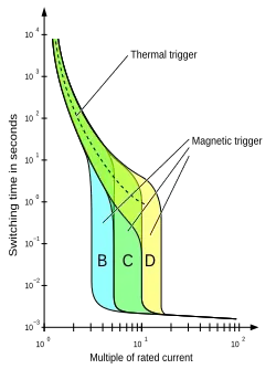 Charakteristiky běžných jističů se označují písmeny B, C a D.[6] Charakteristiky mají stejnou část tepelné charakteristiky v oblasti přetížení, tj. v oblasti nadproudu (vrchní část grafu). Liší se ve zkratové části charakteristiky a reakce na (krátkodobé) zvýšení proudu na násobky jmenovitého (tj. zkratového, spouštěcího) proudu (viz spodní část grafu). Smluvený vypínací proud je proud, při kterém musí jistič vypnout do hodiny (je stanoven na 1,45 násobek jmenovitého proudu). Smluvený nevypínací proud nesmí jistič vypnout nikdy (pro charakteristiky B, C a D je stanoven jako 1,13 násobek jmenovitého proudu).