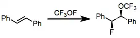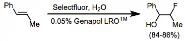 Při jednoduchých fluoracích alkenů často vznikají směsi mnoha produktů. Kofluorace za přítomnosti nukleofilu však vytváří výhradně vicinální alkoxyfluoridy.[11] Alkyny nelze fluorovat pomocí N-F činidel. Za účelem usnadnění kontaktu mezi Selectfluorem a alkenem se do reakční směsi přidávají aniontové tenzidy.