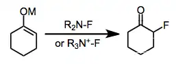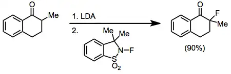Enoláty kovů lze použít s velkým počtem fluoračních činidle, jako jsou NFSI, NFOBS a sulfonamidy. Nejlepší výtěžnosti monofluorovaných karbonylových sloučenin při reakcích s lithnými enoláty se obvykle dosahuje při použití 2-fluor-3,3-dimethyl-2,3-dihydrobenzo[d]isothiazol-1,1-dioxidu. U ostatních enolátů se tvoří mnoho difluorovaných produktů.[14]
