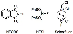 K nejčastějším fluoračním činidlům v organické syntéze patří N-fluor-o-benzendisulfonimid (NFOBS), N-fluorbenzensulfonimid (NFSI) a selectfluor.[1]