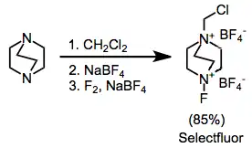 Nejlépe synteticky využitelné amonné soli jsou odvozeny od substituovaných DABCO-bis(amonných) iontů, takovým reaktantem je například Selectfluor.[9] Dají se snadno připravit alkylací a následnou fluorací. Difluorové varianty, které se zdály být lépe využitelné, poskytují pouze jeden atom fluoru.