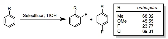 Fluorací sloučenin s vysokou elektronovou hustotou se tvoří arylfluoridy. Nejčastějšími potížemi při těchto reakcích jsou nízká ortho/para selektivita a (obzvláště u fenolů) dearomatizace.[12]