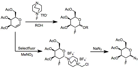 Enolethery a glykaly jsou dostatečně silnými nukleofily na to, aby mohly být fluorovány Selectfluorem.[13] Podobně jako u ostatních alkenů zde lze dosáhnout kohalogenace jak izolací meziproduktu, tak i reakcí s nukleofilem či přímým odstraněním DABCO in situ. Enoly je možné fluorovat enantioselektivně (viz výše) za přítomnosti chirálního fluoračního činidla.