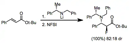 K přípravě chirálních β-amino-α-fluoresterů lze použít tandemovou konjugovanou adici s využitím chirálních nukleofilů.