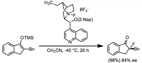 Enantioselektivní metody spočívají v použití stechiometrických množství chirálních fluoračních činidel; příkladem takových reaktantů jsou N-fluoramonné soli cinchonových alkaloidů. Tyto látky lze snadno připravit ze Selectfluoru a podobných alkaloidů.[7]