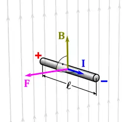 Elektrický proud procházející vodičem sestává z pohybujících se elektrických nábojů. Nachází-li se tedy vodič v magnetickém poli, bude na něj působit Lorentzova síla. Rychlost částice můžeme vyjádřit jako podíl směrového vektoru vodiče délky , kterou elektrický náboj urazí za čas :