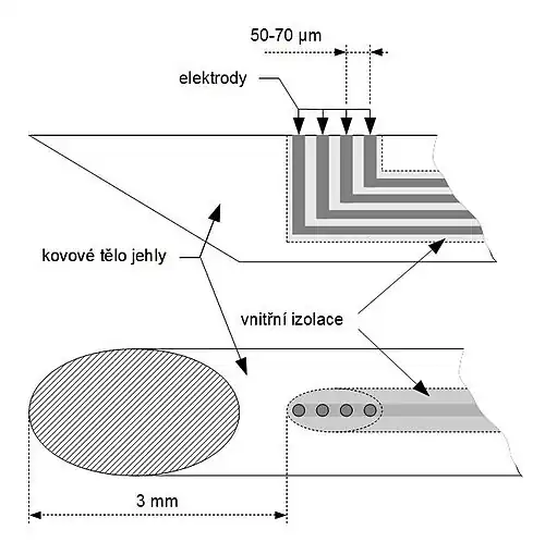 - Koncentrická elektroda (en:Concentric Electrode) – aktivní elektroda elektroda, umístěná ve středu kovového stínění - typicky se jedná o elektrodu, izolovaně umístěnou v otvoru duté jehly, která tvoří referenční elektrodu