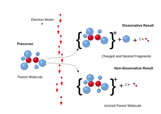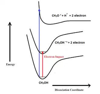 V elektronově ionizačních zdrojích iontů se elektrony vytvářejí zahříváním tenkého drátu, kterým prochází elektrický proud. Kinetická energie uvolněných elektronů by měla být vyšší než ionizační energie zkoumané molekuly. Mezi drátem a zdrojem iontů získávají elektrony energii okolo 70 eV. Vzorek se do zdroje iontů dostane kolmo vůči elektronovému paprsku. Vysokoenergetické elektrony v prostředí s nízkým tlakem (10−3 až 10−4 Pa) vyvolají fluktuace v elektrickém poli okolo molekul a způsobí jejich ionizaci a fragmentaci.[9] Fragmentaci při elektronové ionizaci je možné popsat pomocí Bornových-Oppenheimerových potenciálových křivek, jak je znázorněno výše; červená šipka označuje energii potřebnou k nedisociativní ionizaci, zatímco modrá označuje disociativní procesy, kterými vznikají sekundární ionty. Vytvořené radikálové kationty putují do hmotnostního analyzátoru. Fragmentaci často lze předvídat, což umožňuje získat údaje o struktuře analytu.