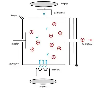 Na obrázku výše je zobrazeno schéma přístroje pro elektronovou ionizaci. Zdrojem iontů je kovová katoda, nejčastěji ve formě vlákna tvořeného wolframem nebo rheniem, která se zahřívá. Mezi katodou a zdrojem iontů je napětí 70 V, které dodává elektronům kinetickou energii 70 eV. Potenciál anody (elektronové pasti) je mírně kladný a umístěn mimo ionizační komoru naproti katodě. Tato elektronová past vychytává nevyužité elektrony. Vzorek je aplikován do příslušné díry. Ke zvýšení míry ionizace se rovnoběžně se směrem pohybu elektronů vkládá slabé magnetické pole; elektrony se tak pohybují po úzké šroubovicové dráze, díky tomuto tvaru je jejich dráha delší. Vznikající kationty se urychlují odpuzovací elektrodou. S využitím potenciálu vzhledem ke zdroji iontů a udržování základního potenciálu u místa odchodu elektronů ionty vstupují do hmotnostního analyzátoru s konkrétní hodnotou kinetické energie. Kondenzaci vzorku se zabrání zahříváním na přibližně 300 °C.[3]