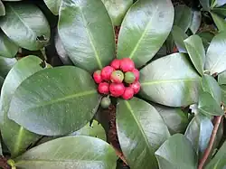Stálezelená, dvoudomá dřevina vyrůstající obvykle jako strom 3 m vysoký, výjimečně je vyšší, nebo do 2 m vysoký keř. Má rozložitou korunu s vystoupavými, hrubými, od spodu olistěnými větvemi a šedou, hladkou a jemně čočkovitou kůrou. Listy s 1 cm řapíkem vyrůstají hustě, střídavě, téměř přeslenovitě. Čepel mají jednoduchou, pevnou, kožovitou, široce obvejčitou, dlouhou 10 až 20 cm, širokou 4 až 19 cm a po obvodě celistvou, na svrchní straně je tmavě zelená a někdy žláznatě tečkovaná, na spodní straně je světlejší a má výrazné střední žebro a patrné boční žilky.