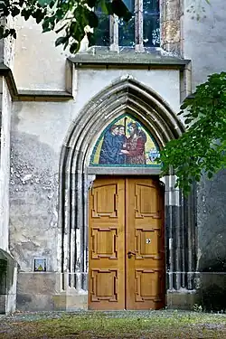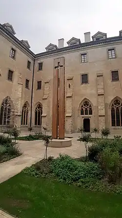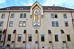 Západní strana budovy opatství s mozaikou v beuronském stylu