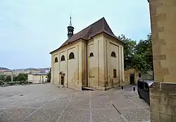 Původně románský farní kostel sv. Kosmy a DamiánaPodskalí, nejstarší část areálu Na Slovanech
