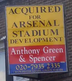 Cedule zobrazující koupi Ashburton Grove pro výstavbu nového stadionu