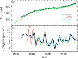 Koncentrace methanu (CH4) v atmosféře roste a v roce 2019 překročila 1860 ppb, což je dvaapůlnásobek předindustriální úrovně.[19] Methan sám o sobě způsobuje přímé radiační působení, které je druhé nejsilnější po oxidu uhličitém (CO2).[20] V důsledku interakcí se sloučeninami kyslíku stimulovanými slunečním zářením může CH4 také zvyšovat přítomnost ozonu a vodní páry s kratší životností v atmosféře, což jsou samy o sobě silné oteplovací plyny: atmosféričtí vědci toto zesílení krátkodobého oteplovacího vlivu methanu nazývají nepřímým radiačním působením.[21] Při těchto interakcích vzniká také CO2 s delší životností a menší účinností. Včetně přímých i nepřímých vlivů je nárůst methanu v atmosféře zodpovědný přibližně za třetinu krátkodobého globálního oteplování.[1][2]