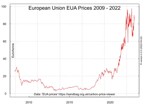 - ↑ Development of EU ETS (2005-2020). ec.europa.eu [online]. [cit. 2022-05-07]. Dostupné online. (anglicky)