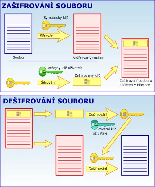 EFS šifruje soubory použitím hromadné symetrické šifry (také známou pod zkratkou FEK - File Encryption Key), protože zašifrování a dešifrování velkého objemu dat trvá kratší dobu, než použitím asymetrické šifry.