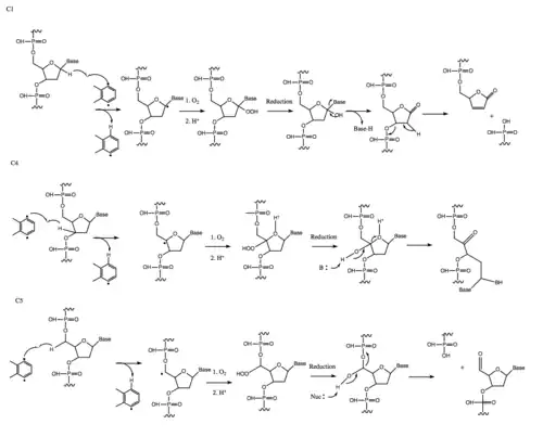 Cyklizace endiynových skupin vytvářejí 1,4-benzenoidové diradikály, které fungují jako nukleofily a atakují elektrofily za vzniku stálejších sloučenin. V organismech mohou reagovat s DNA za odštěpení dvou vodíků z opačných stran molekul sacharidů, což může proběhnout na C1, C4, nebo C5.[3] DNA radikály následně vytvářejí překřížené struktury nebo reagují s O2, a tím vyvolávají jedno- nebo oboustranné štěpení DNA.[4]