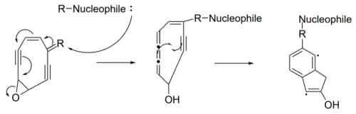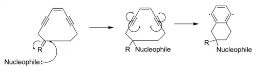 Dalším způsobem aktivace endiynů je Myersova-Saitoova cyklizace, při níž se z hlavice endiynu stane diradikál. Při tomto mechanismu musí být alkenová skupina součástí dienového systému, s dvojnou vazbou ve vyměnitelné skupině. Dvojnou vazbu této skupiny atakuje nukleofil, čímž vyvolá posloupnost přesunů elektronů; jedna z trojných vazeb endiynu se přitom přemění na kumulenovou.[2] Kumulen a zbývající alkyn odevzdají po jednom elektronu a utvoří novou kovalentní vazbu.