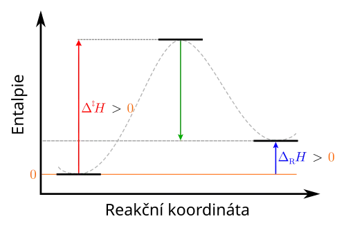 Zjednodušený graf endotermické reakce ukazuje, že energie reaktantů (oranžová přímka s hodnotou H=0) je nižší než energie produktů (modrá čárkovaná přímka s hodnotou ΔRH > 0).