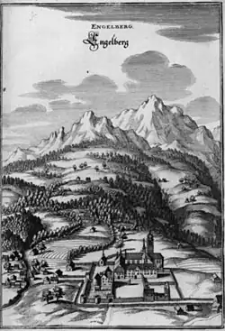 Název Engelberg se odvozuje od legendy, podle níž hlasy andělů z výšin hory Hahnen podnítily založení kláštera. Anděl se objevuje i v městském znaku. Klášterní komunita (do roku 1615 tvořená mnichy a jeptiškami jako společný mužský i ženský klášter) se stala jádrem miniaturního duchovního státu, který se ve 13.–14. století dostal pod patronát konfederátů. Založila zde klášter, písařskou a malířskou školu, z níž se vyvinula dnešní engelberská kolegiátní škola, která přinesla údolí slávu i za hranicemi Švýcarska. S rostoucími touhami po svobodě ze strany světské moci se klášter od 15. století začal postupně vzdávat některých privilegií.